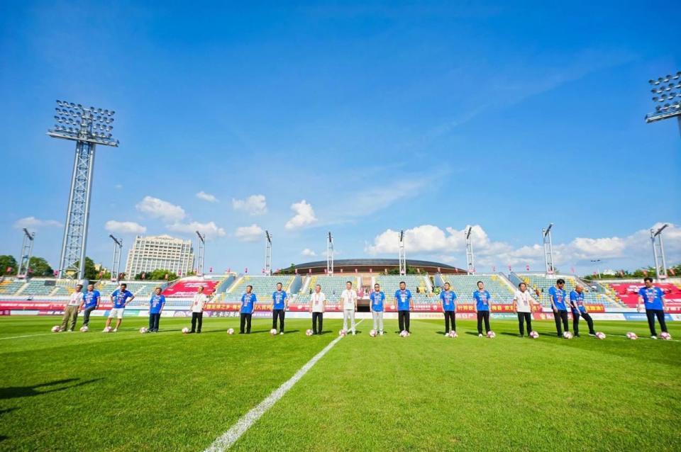 ▲广东省体育局副厅级干部雷检军、广东省足球协会主席谢昌晶 、全国政协委员曾智明、梅州市人民政府副市长代伟、梅州市政协副主席韩小林、梅州市政协副主席陈元星、梅州市政协党组成员梁维、广东省足球协会副主席周穗安等嘉宾为比赛开球
